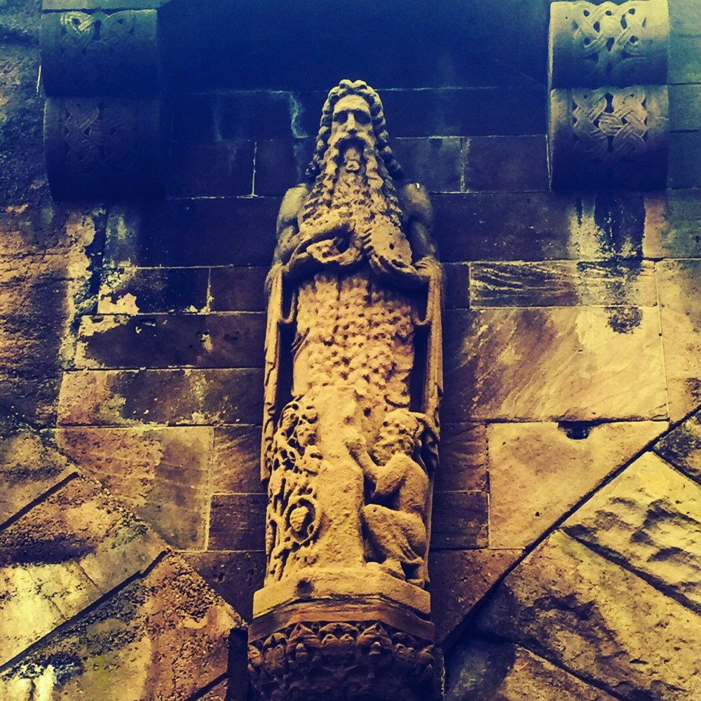 Kaum beachtet, weil man mit ca. 70 kmh daran vorbei fährt, bewacht Vater Rhein die Brücke auf der linksrheinischen Seite (von der Stadt aus gesehen Richtung Süden). In seinen Händen hält der Flussgott einen Fisch und ein Zahnrad – wohl Symbole für Industrie und Fischerei. Zu seinen Füßen hockt eine Person, vielleicht ein Zwerg? Der Sandstein, aus dem die Statue gemacht ist, hat schon ein bisschen gelitten mit den Jahren, daher sieht das Gesicht beinahe aus, wie ein Totenkopf mit Bart. Links sind Weinreben zu erkennen, wohl ein Symbol sowohl für Christus, als auch der Fruchtbarkeit.